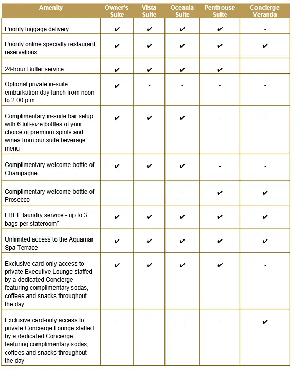 Concierge Level Veranda Staterooms showcase a refined Continental inspired design with thoughtfully perfected details. Premium amenities include a private teak veranda, comfortable seating area, refrigerated mini bar, and an oversized bathroom featuring additional storage and an enlarged walk in shower. Guests also receive exclusive access to the private Concierge Lounge, offering a dedicated Concierge, complimentary beverages, daily treats, and a curated selection of international newspapers and magazines.