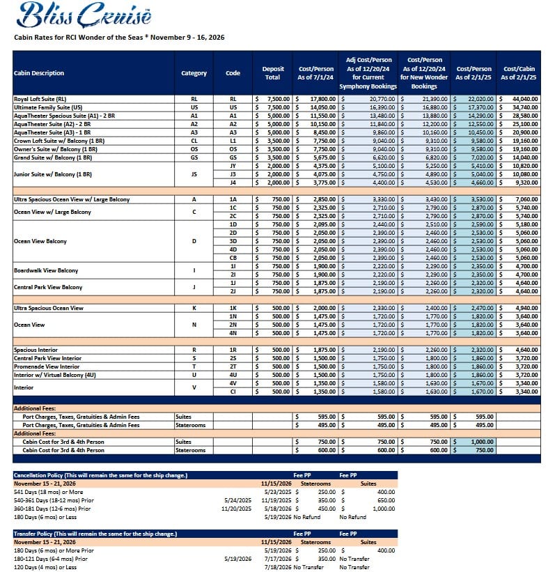 NOTE:  Cancellation penalties up to 100% forfeiture of your cabin cost and taxes/port charges apply to all transactions.  See chart below.   In addition, all transactions are subject to Castaways Travel and parent company, Fox Travel Terms and ConditionsPlus Terms and Conditions of Royal Caribbean and Bliss Cruise Terms & Conditions.