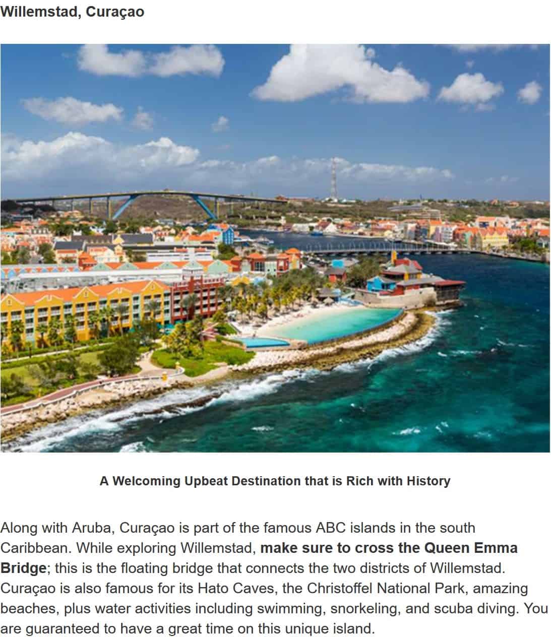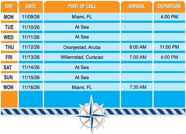 Due to the change of ports and the re-deployment of Symphony of the Seas to Galveston by Royal Caribbean, Bliss Cruise negotiated and added Wonder of the Seas as the new vessel for the Bliss November 2026 charter from Ft. Lauderdale to Aruba & Curacao including 2 days at sea to start your adventure followed by another 2 days at sea to wrap up your voyage.