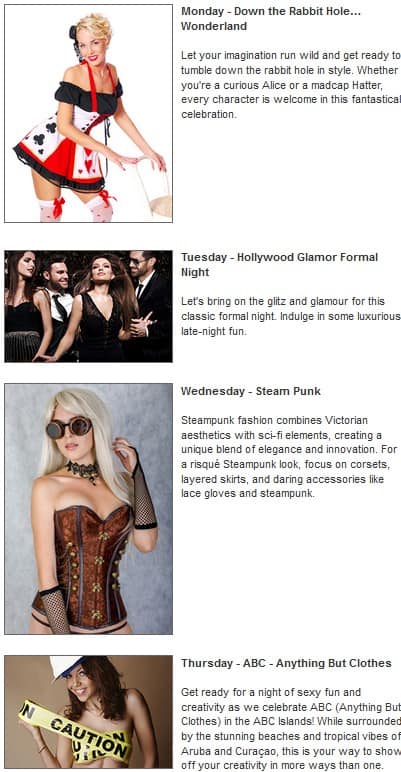 These charters are for adult, clothing-optional couples only 21 years of age and older. These charters are lifestyle-friendly.  Nudity or participation is completely voluntary and not compulsory   If revealing costumes, adult themes, sensual behavior among adults in private or nudity may offend you, please contact your travel advisor for options to visit other adult venues or resorts.