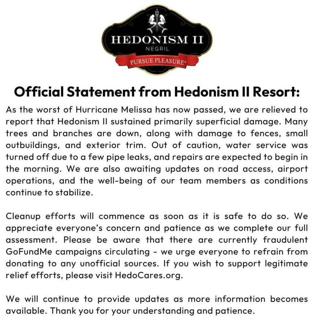 Hedonism reported no major damage-only downed trees and other minor clean up and maintenance issues. More details are to follow about the staff, personnel, the resort, transportation and airports.