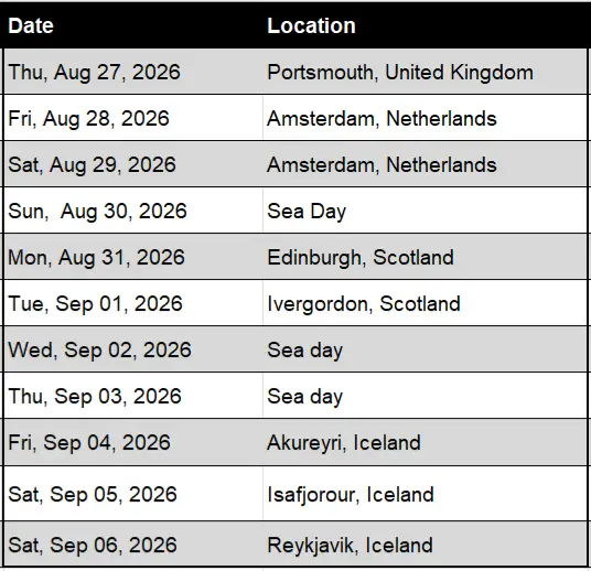 Illustrated map showing the Virgin Voyages route from Portsmouth to Amsterdam, Edinburgh, Invergordon, Akureyri, Isafjordur, and Reykjavik for the August 2026 sailing